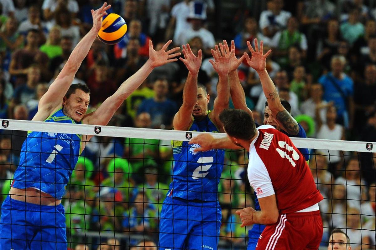 Metropolia Bydgoska26-09-2019_ mistrzostwa Europy siatkarzy, półfinał Polska – Słowenia_ Ljubljana, Dvorana Center Stozice – Michał Kubiak, Alen Pajenk, Toncek Stern – cev.eu