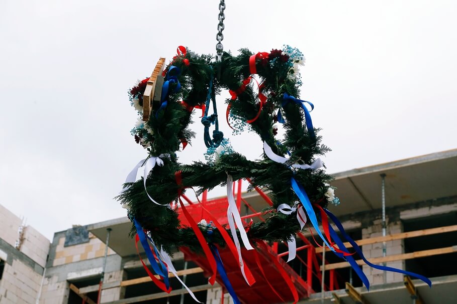 Metropolia BydgoskaLaurowy Zakątek w Fordonie coraz bliżej. Alstal Dom przechodzi do ostatniej fazy inwestycji [ZDJĘCIA]30-09-2025_Bydgoszcz Fordon_zawieszenie wiechy_Laurowy Zakątek – SF-25