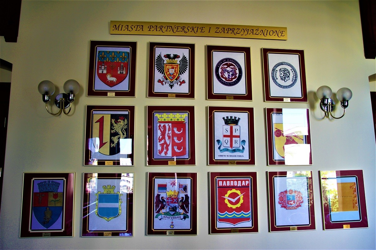 Na zdjęciu: Poza nazwami i symbolami Miast Partnerskich uwidocznionymi na jednym z pięter ratusza - w mieście wpółpraca miasta z pobratymcami jest w ogóle niewidoczna.