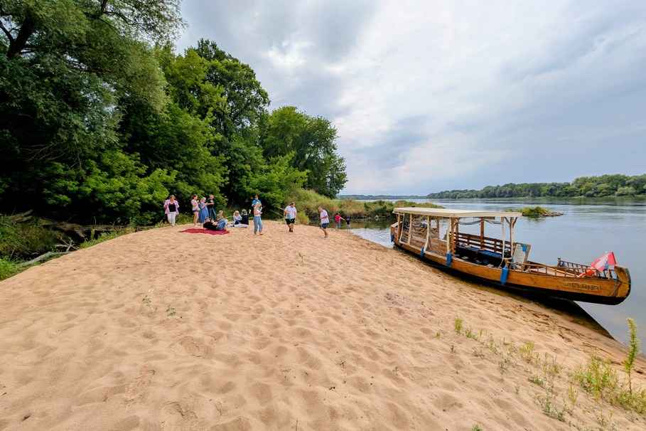 Przewodniczka podkreślała, że mimo niskich stanów Wisłą wciąż można pływać. W niektórych miejscach ma ona nawet osiem metrów głębokości. Nurt pozwala zatem na poruszanie się wielu jednostek, stąd pomocne są znaki na brzegach – na brzegu lewym są to zielone romby, a na prawym czerwone kwadraty. Znaki poprowadziły „Wiślaną” do wysepki na prawej stronie Wisły, gdzie odbył się mały piknik z domowym ciastem. Piaszczysty teren faktycznie jest oddzielony od lądu małym – w skali Wisły – strumieniem. Ląd – czyli Wielka Kępa Ostromecka – też kiedyś była oblewaną z obu stron wyspą.