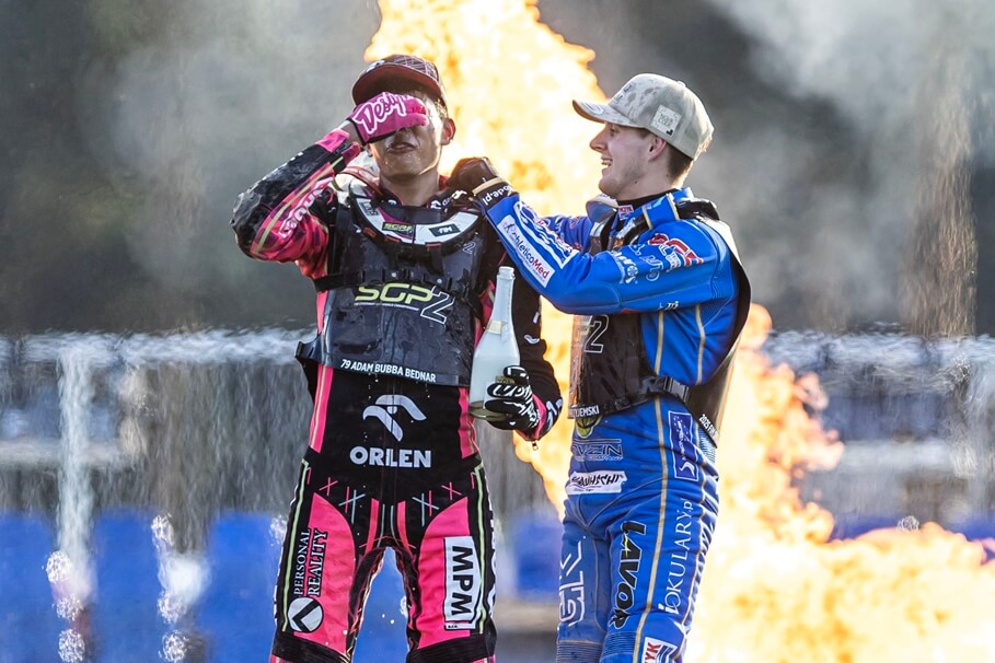 Metropolia BydgoskaSGP2 w Rydze: niespodziewany triumfator, Przyjemski stanął na podium1-08-2025_żużel_FIM Speedway Grand Prix 2 Ryga_podium_Adam Bednar, Wiktor Przyjemski_mat. prasowy