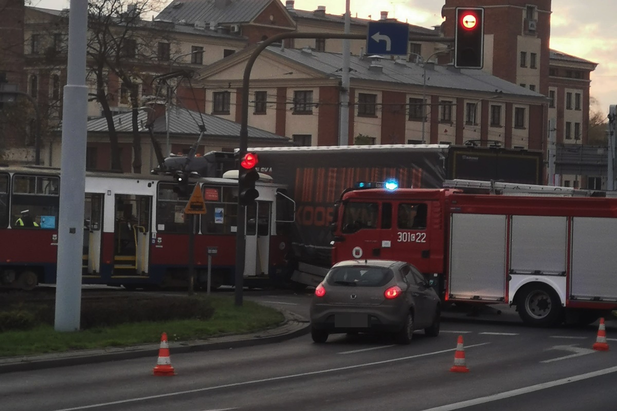 Metropolia BydgoskaWypadek z udziałem tramwaju i ciężarówki na rondzie Fordońskim [ZDJĘCIA]25-10-2019_ wypadek rondo Fordońskie – JS (2)